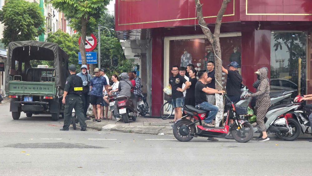 Lực lượng cảnh sát cơ động, bảo vệ an ninh cơ sở được phân công nhiệm vụ đứng gác, canh coi xung quanh trước cửa trụ sở văn phòng công chứng Đặng Ngọc Tuấn để đảm bảo an ninh trật tự.