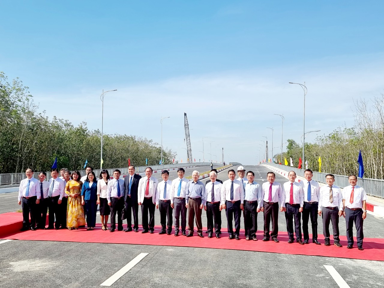 Nguyên Chủ tịch nước Nguyễn Minh Triết (hàng trên, thứ chín từ phải qua) cùng bí thư Tỉnh ủy, chủ tịch UBND tỉnh và lãnh đạo hai tỉnh Bình Dương, Tây Ninh tại lễ thông xe cầu và đường nối hai tỉnh ngày 26-12 – Ảnh: BÁ SƠN