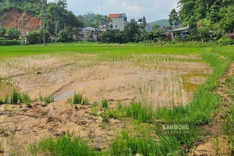 Lớp bùn đất dày hàng chục cm khiến gia đình dù nhiều lần thu dọn vẫn bất lực, ruộng vườn bị vùi lấp hoàn toàn không thể canh tác.