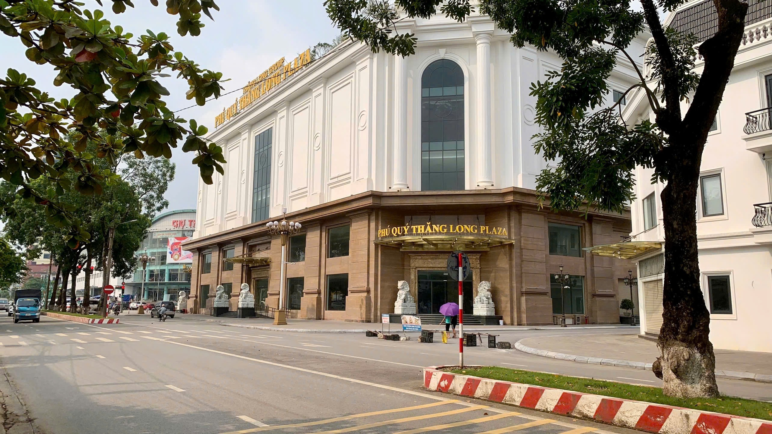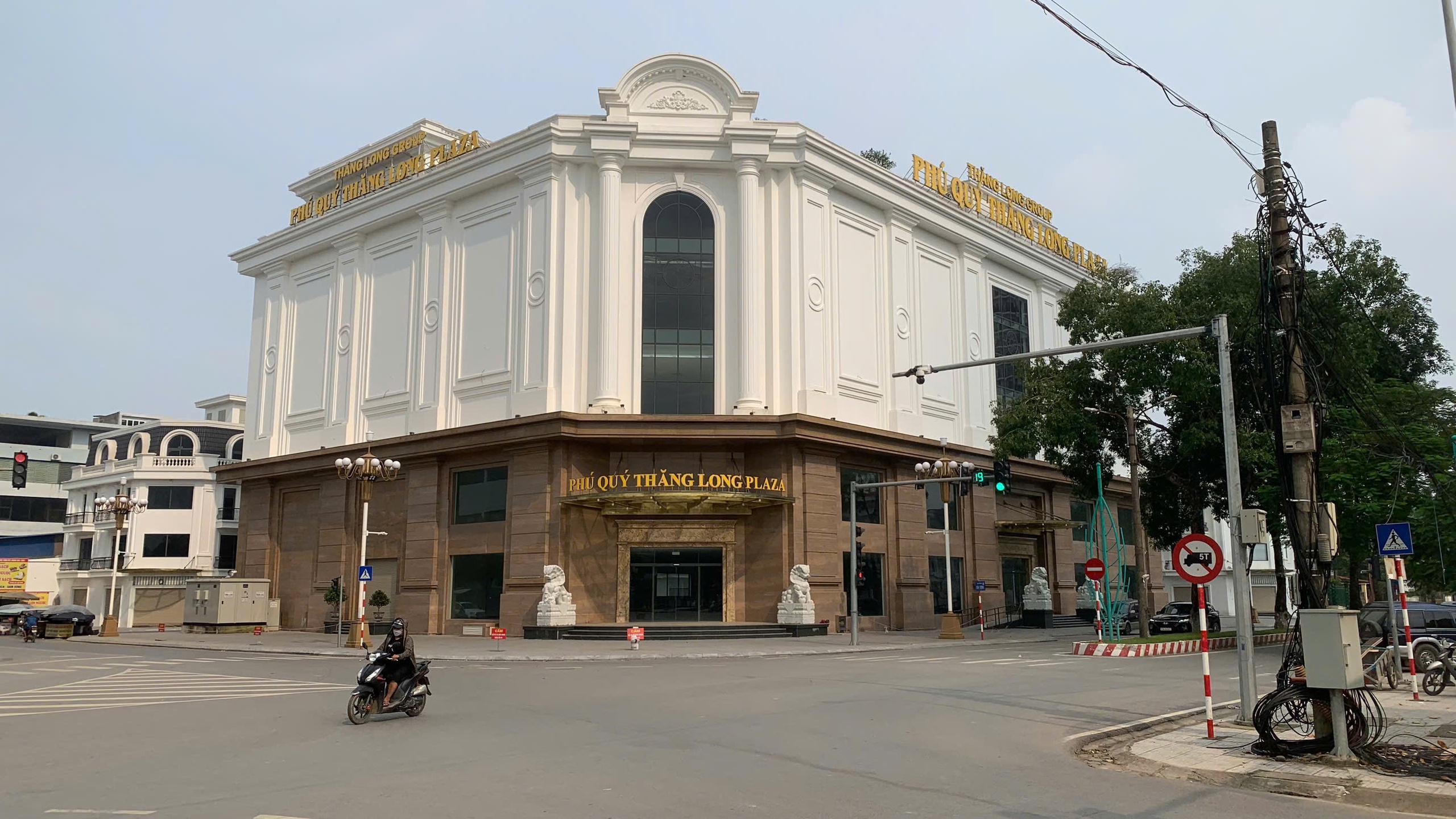 Nhìn bên ngoài, khu trung tâm thương mại đã gần như hoàn thiện và đã được gắn biển tên “Phú Quý Thăng Long Plaza”.