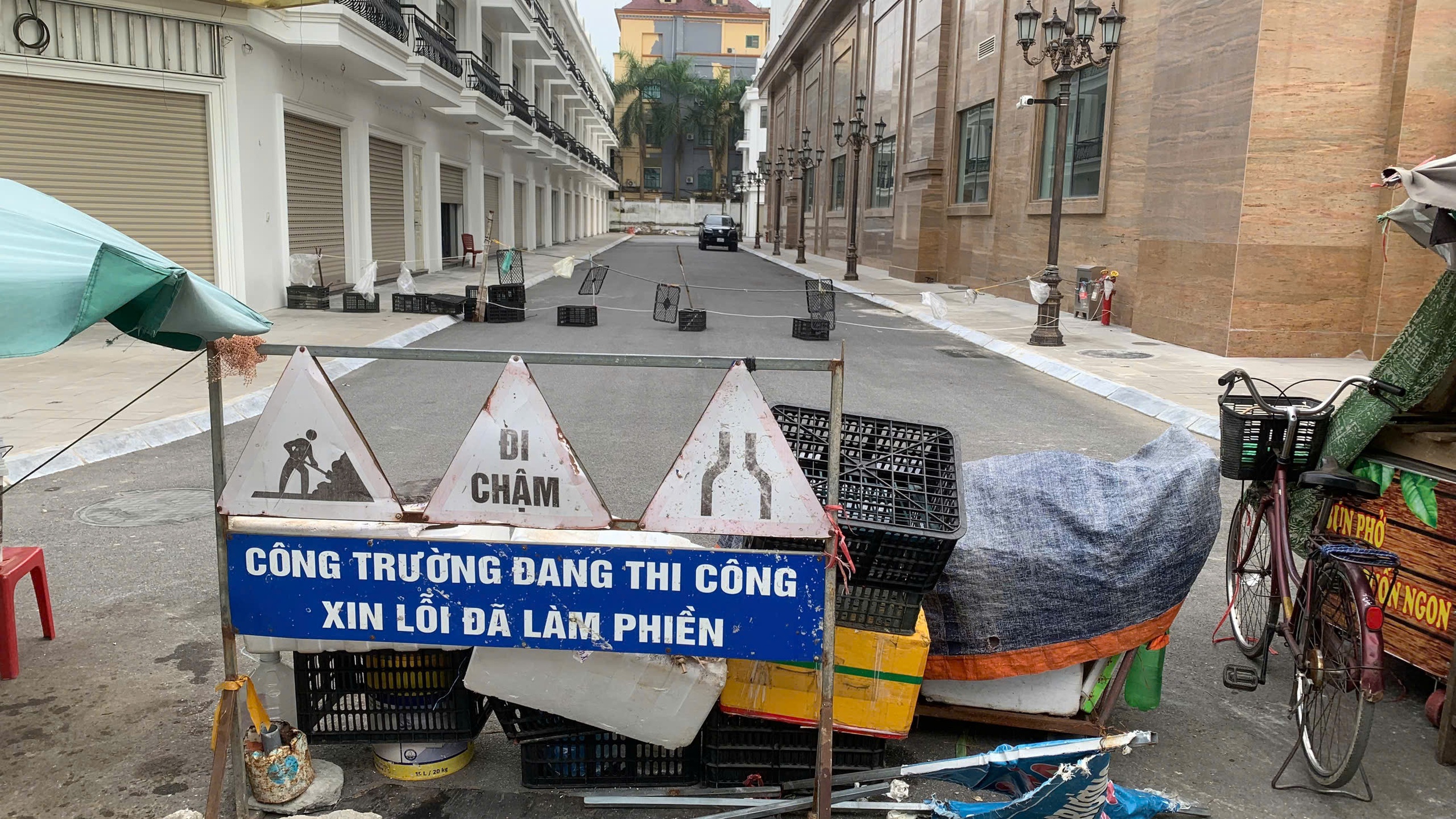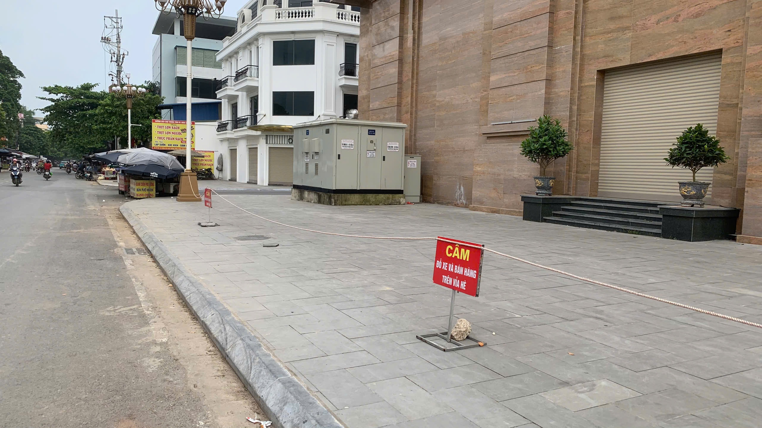 Cửa ra vào công trình thường xuyên trong tình trạng “cửa đóng then cài”. Vỉa hè trước công trình cũng được rào chắn, cảnh báo cấm lấn chiếm, bán hàng.